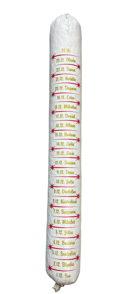 Originální dárek, který potěší. Adventní salám. Náplň náše vysočina Černocký. Trvanlivý salám, skladovat můžete ve špajzu a každý den ukrojit kolečko a spříjemnit si čekání na Vánoce. Doporučujeme. Na nic nečekej a objednej. Omezené množství.