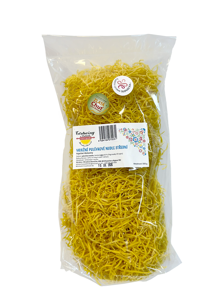 Polévkové nudličky střední tloušťky pro ty, kdo mají raději pořádně hustou polévku. Vyrobeno z čerstvých vajec z místní farmy a mouky z nedalekého mlýna v Kyjově. Ocenění: Tradiční výrobek Slovácka, Zlatá chuť jižní Moravy
