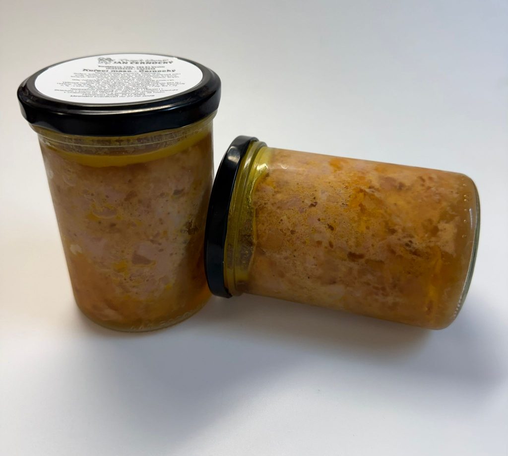 Novinkou u nás je Kuřecí maso ve skle. Naše kuřecí maso porcované u nás pouze z českých farem v top kvalitě pěkně zamícháme se speciálním kořením a naplníme do sklenic a vyrobíme pro vás konzervy. Výrobek je ze 100 % kuřecího masa. Doporučujeme, ochutnejte, Můžete na chleba pěkně s cibulkou, do pomazánky, s rýží nebo s bramborem, k těstovinám, špagetám. Na dovolenou, na chatu nebo pod stan. Vyzkoušejte, určitě si ho zamilujete.